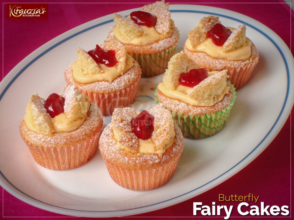 - Preheat the oven to 180C and prepare a cupcake pan with liners.Sift/sieve the flour with the baking powder and salt three times to properly aerate the flour for a lighter cake.In a mixing bowl, beat the butter/margarine with the sugar until light and creamy. Then add the eggs one at a time, beating well after each addition. Add the vanilla essence and mix well, scraping down the sides of the bowl regularly.Then add the flour in three additions, alternating with milk (start and end with the flour). You can use a mixer for this but on LOW speed or use a spatula to ensure the batter does not get over mixed.Fill up the cupcake liners to about two-thirds full.Bake in a preheated oven on the middle rack for 15 minutes or until a toothpick stuck in the center of each cupcake comes out clean.Remove the cupcakes from the pan onto a wire rack and allow them to cool.In the meantime, have your jam and custard (or cream) ready. For my custard recipe, check HERE.Using a sharp knife, cut a 2 cm deep by 3 cm wide round piece from the top of each cake. Cut this round piece in half to form two wings and set aside. Now fill the cupcake hole with cream or custard or whatever you want and then place the half pieces of the cake on top of the filling to form wings. Add a small dollop of jam right in the centre between the wings. Dust lightly with icing sugar and serve.Enjoy!  🙂