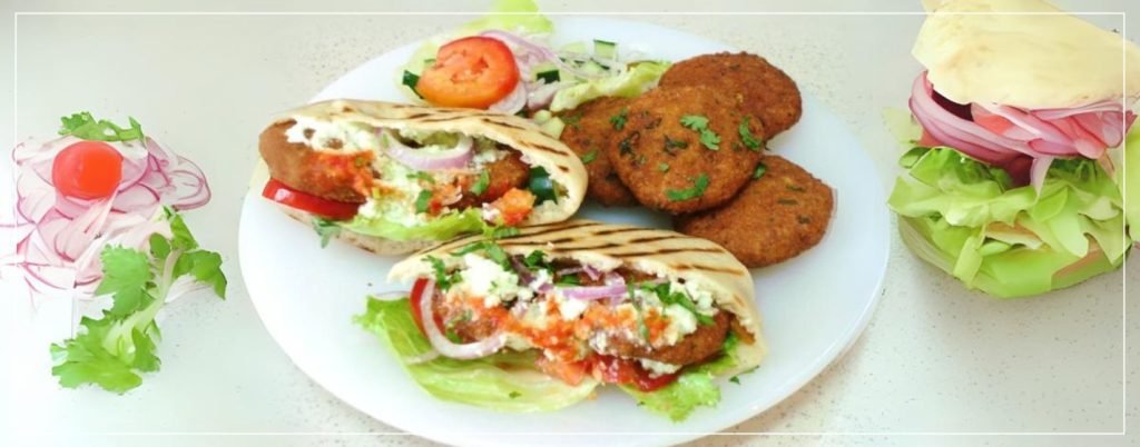 A middle-eastern street food consisting of deep-fried patties made from grinded chickpeas, served in home-made pitas with lots of salad, onions, tomatoes, cucumber, chutneys, tahini …