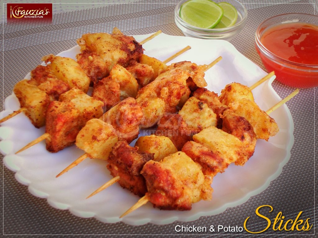 - Then take your skewers (use small ones for these, cuter to handle). Thread the cooked chicken and potato cubes alternatively. Repeat until all the skewers are done. Sprinkle the skewers very lightly with gram/besan/chickpea flour or cornflour/cornstarch.
