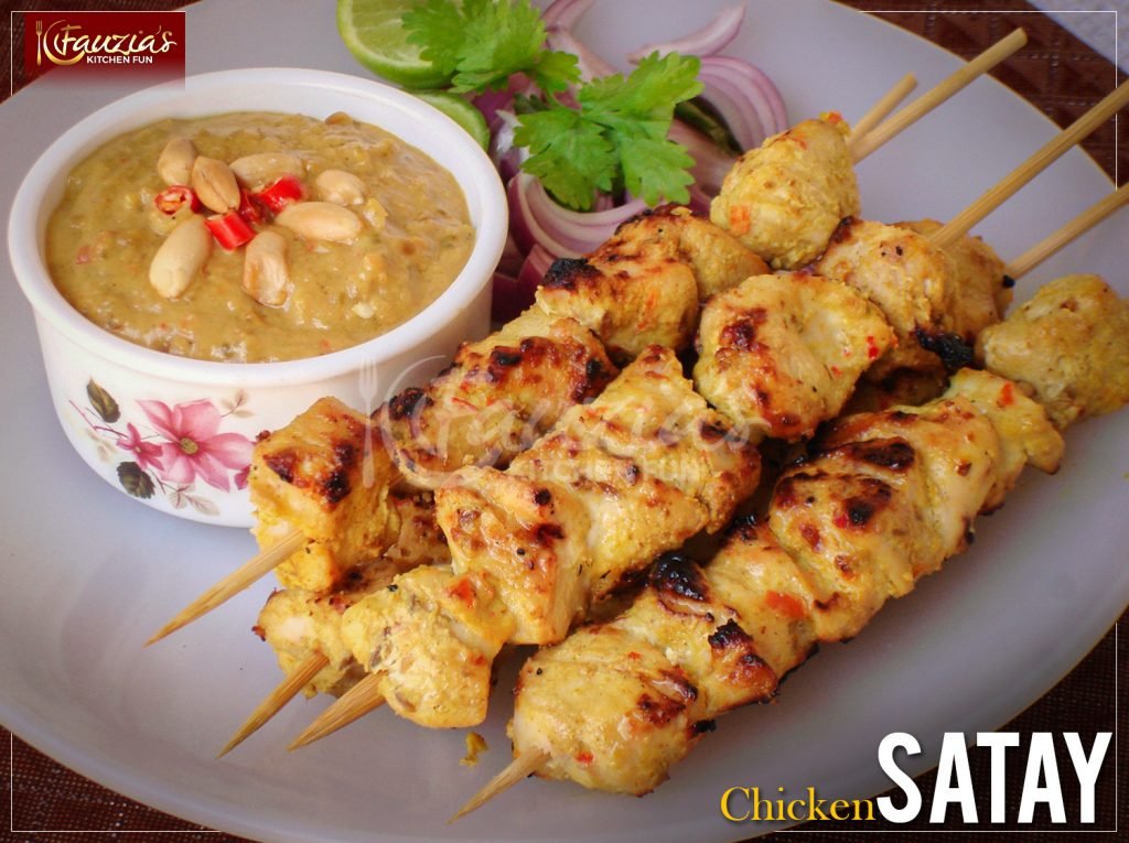 - Thread the chicken cubes onto wooden skewers. Place a grill pan over medium heat and brush it with oil. Grill the chicken satays for 3 to 5 minutes per side or until nicesly seared and cooked through. You can also cook these over a BBQ grill.For the peanut sauce, mix the onions, garlic, ginger and chilli and then blend into a paste. Heat the oil in a pan, then add the spice paste and saute for a couple of minutes over very low heat. Add the sugar, lime juice and soy sauce and stir them in. Then add the coconut milk and simmer for about 5 minutes while stirring constantly. Next, add the ground peanuts and peanut butter plus the hot water. Season with salt and stir to combine. Simmer until the sauce thickens slightly. Allow to cool, the sauce will continue to thicken as it cools. If it gets too thick, add a bit of hot water and stir.Serve the chicken satay with peanut sauce, some fresh salad or cucumber and onion slices.Enjoy!