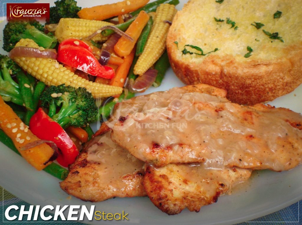 - I have served it here with Stir-Fried Veggies and Garlic Bread.For the ChickenYou can either: Grill the chicken steak on a bbq grill on both sides until done (about 12-15 minutes per side)ORHeat a hot steak pan or heavy griddle, add 2 tbsp. of oil to it and fry the steak on medium heat for about 10 minutes per side. Then increase the heat and give it a final fry of about 3-4 minutes per side or until it begins to slightly char. Do not crowd the pan, fry a few pieces at a time.For the Light Creamy Pepper SauceHeat the butter, add the onions and fry until golden. Add the flour, pepper, garam masala and salt and cook on low heat for 3 minutes, then slowly add the stock and the corn flour. Cook until the stock thickens slightly, then add the cream and stir together. Let this simmer for a few minutes, adjust taste and turn off.For the veggies, I boiled the carrots and peas for just about 5 minutes, until they are halfway done, then drain the water. Added the sweet corn from a can. Then in a pan, heat 1 tbsp. of butter, once it melts add the combined veggies and stir fry on low heat for a few minutes. Sprinkle salt, pepper and a dash of cumin powder. Turn off the heat and serve! 🙂Serve your steak with the sauce drizzled over it, and with the sides of your choice! Enjoy!