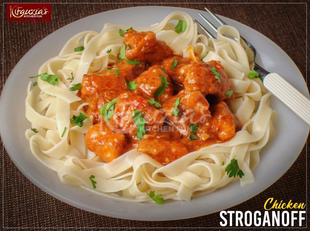 As much as Beef Stroganoff has always been a family favourite, I sometimes like preparing it using chicken which I find faster adn just as flavourful. This is my version of chicken stroganoff, served here over noodles but it can also be served with fries or rice depending on preference.