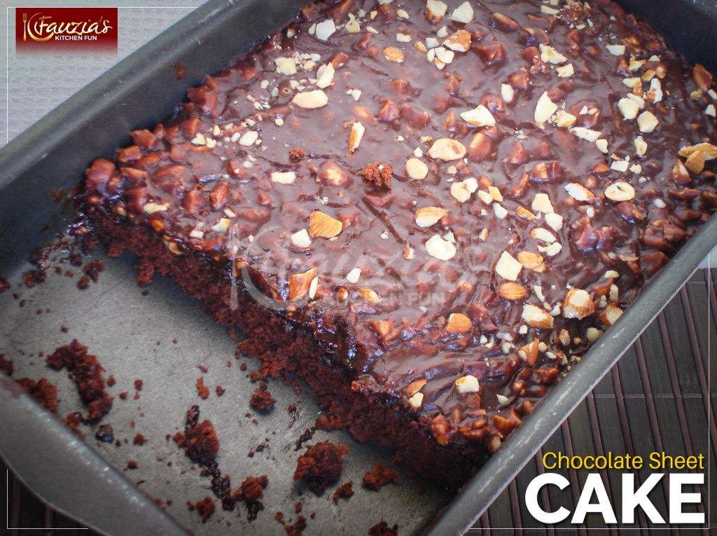 - Grease a 9×11 sheet pan. You do not have to line it as this cake will be served from the same pan that it is baked in.Preheat the oven to 170 degrees C.In a big bowl, sift the flour and baking soda, then add the sugar and salt, combine and set aside. In a second smaller bowl, put the buttermilk, egg and vanilla and mix lightly with a fork. Set this aside too.In a saucepan, put the butter, oil, cocoa powder, instant coffee powder and water and bring to a boil. Take it off the heat and pour over the flour mixture in the big bowl. Stir lightly to allow it to cool.Add the egg, buttermilk and vanilla mixture to the flour/butter mixture and stir everything together one final time. Pour into your greased pan and bake for about 15 minutes or until a toothpick stuck in the center comes out clean or with just a few moist crumbs.Place your pan on a wire rack. As it starts to cool, you can quickly prepare the frosting.