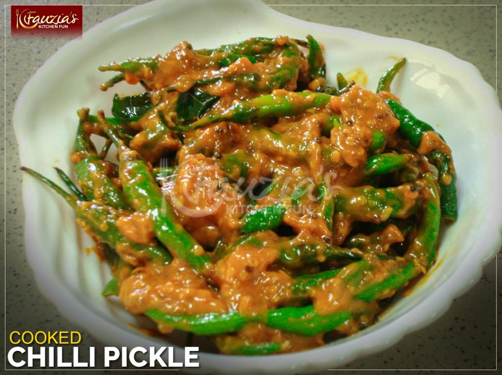 Heat the oil in a pan and add the rai/mustard seeds. Once they splutter, add the chopped curry leaves and garlic paste. Stir and quickly add in the prepared gram flour paste. Cook on low heat until the oil separates, adding a bit of water if the mixture begins to stick. Make sure to keep stirring or adding a bit of water as needed, do not allow the mixture to get lumpy…let it stay smooth. Once the mixture has lost its raw taste/smell, add the green chillies and sprinkle the remaining salt on them. Stir fry, adding a bit of water every now and then if needed until the chillies soften slightly and the masala coats them. This should take about 7-10 minutes depending on the size of the chillies. Lastly, sprinkle the sugar and achar masala, and squeeze in the lemon juice. Give everything a final stir, leave it on the heat for a minute then turn it off. Serve as required. This pickle will keep if refrigerated for up to 2 weeks. Store in a glass jar to retain freshness.