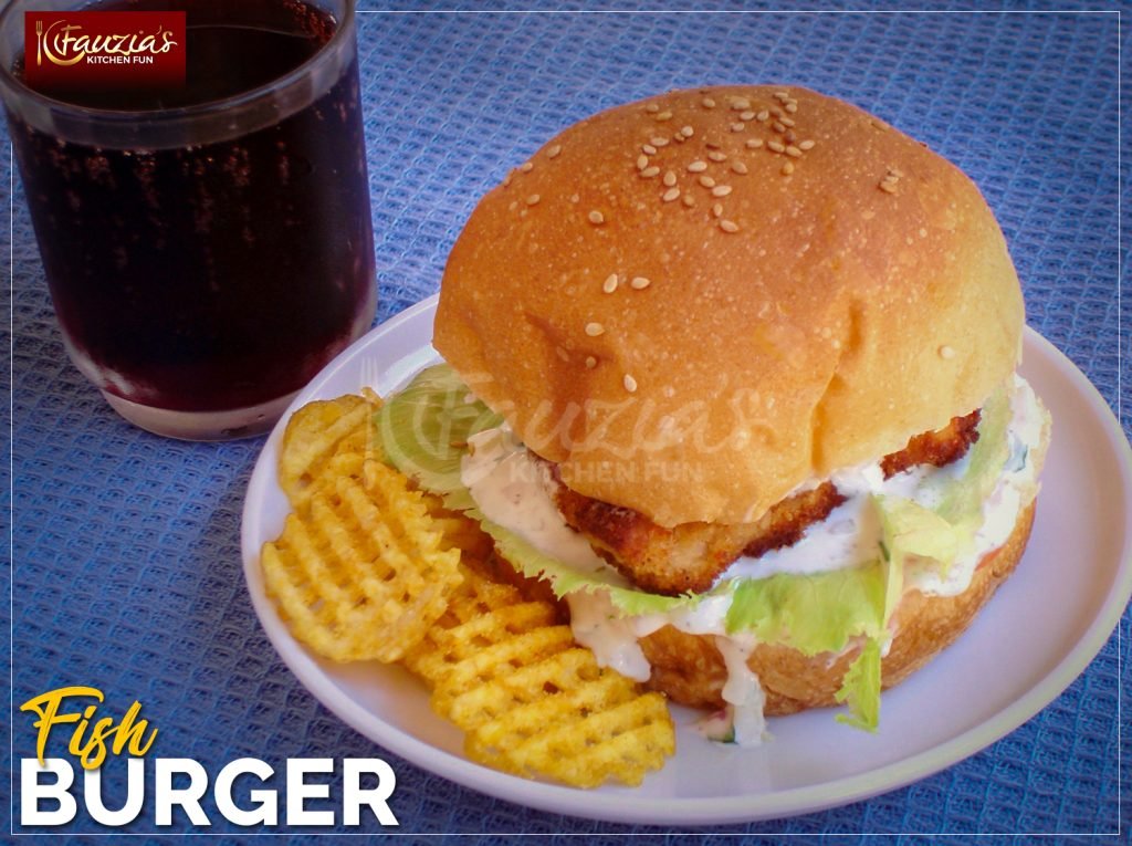 - Dip the marinated fish slices first in egg then in breadcrumbs and shallow fry for 3 minutes per side on medium heat until done, golden and crispy. Remove and drain on kitchen towels.Assemble the burgers by spreading some ketchup on the bottom half of the toasted bun, then add a lettuce leaf, spoon on some tartar sauce, top with your fried fish fillet, followed by some more tartar sauce if you like it extra juicy.Cover with the top of the burger bun and serve with a side of fries or chips. Enjoy!