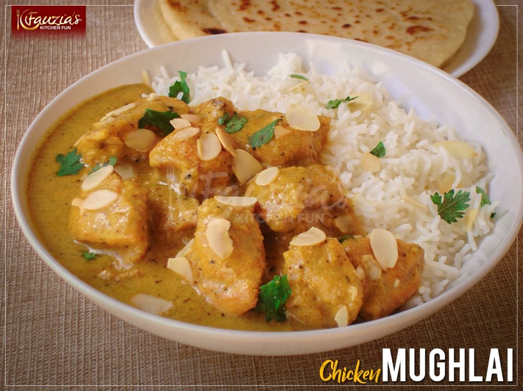 - Marinate the chicken in the marinade ingredients for 30 minutes or refrigerate up to overnight.When ready to cook, remove the chicken from the fridge at least half an hour before you begin, to allow it to come to room temperature.Soak the peeled almonds, cashew nuts and saffron in hot water for 10 minutes and then grind to a smooth paste. Then roast all the remaining Mughlai Paste spices (dried red chillies, cumin seeds, coriander seeds, cinnamon stick, cloves, cardamom, bay leaf and whole black pepper). Grind the roasted spices to a fine powder. Add this spice powder into the nut/saffron paste and mix well. This will be your Mughlai Paste.Heat the ghee or oil in a pan and then add the marinated chicken pieces. Fry on both sides until slightly browned (but not cooked through) and then remove them onto a plate. In the same pan, add the chopped onions and fry until golden. Then add in the garlic and ginger paste, cook for a couple of minutes until fragrant.Next add the Mughlai paste and stir over medium low heat. Add a splash of water occasionally if you find that the paste is sticking to the pan. Once this paste thickens, add the yoghurt and stir it well. Then add the chicken stock (or water) followed by the cream. Stir well and allow to simmer for about 2-3 minutes. Add salt as needed.Lastly, add in the browned chicken pieces and allow them to cook gently in the creamy sauce over medium low heat, stirring occasionally until the sauce thickens and the chicken pieces are cooked through. This should take about 15 to 20 minutes.Taste and adjust for salt. Sprinkle in the garam masala and turn off the heat.Garnish with flaked almonds and vibrant fresh coriander. Serve over rice or with naans.Enjoy!