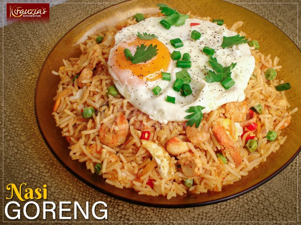 - Wash and rinse out the rice, then soak for 30 minutes. Drain the water and boil the rice until cooked. Drain and set aside to cool. This can be done at least a few hours ahead or even a day before.Beat the eggs with sesame oil and salt, then set aside.Heat a large pan, add the veg oil. When very hot, add the red and green onions (reserve the green parts for garnishing) and stir fry for a couple of minutes. Add the ginger, garlic, pepper, shrimp paste, chopped chilli, turmeric, cumin and coriander powders. Then add the chicken and shrimp and stir-fry on high heat for another 2-3 minutes.Add the boiled rice, boiled peas and carrots and continue to stir-fry for another 3 minutes. Then add the chilli sauce or sambal oelek and soy sauce/kecap manis. Continue to stir fry for a couple of minutes.Finally, with the heat on high, make a hole in the center of the rice, then add the beaten eggs and scramble them into the rice. Continue to stir fry for another minute to ensure all the egg is cooked and well combined in the rice. Alternatively, you can cook the eggs as an omelette in a separate pan and then cut it up into strips and mix it into the rice before serving.Serve the rice with a sunny fried egg on top and a coriander, red chilli and green onion garnish.Enjoy!Â