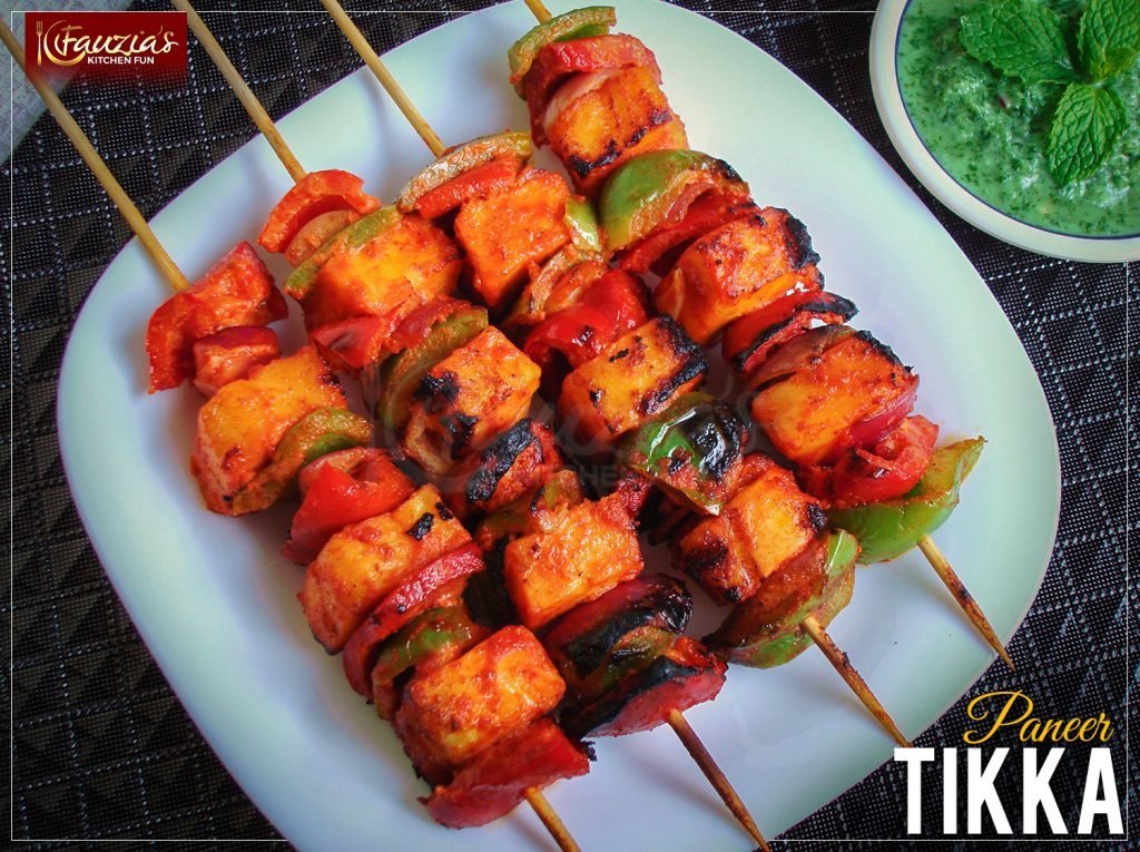 Paneer tikka is an Indian dish made from cubes of paneer (cottage cheese) marinated in spices and then grilled with capsicum and onions. It is a vegetarian alternative to chicken tikka. The trick in grilling these amazingly delicious skewers is to ensure that the paneer, whilst perfectly succulent and tender, should also have a slight crisp singe on the surface. This dish is normally served with mint chutney.