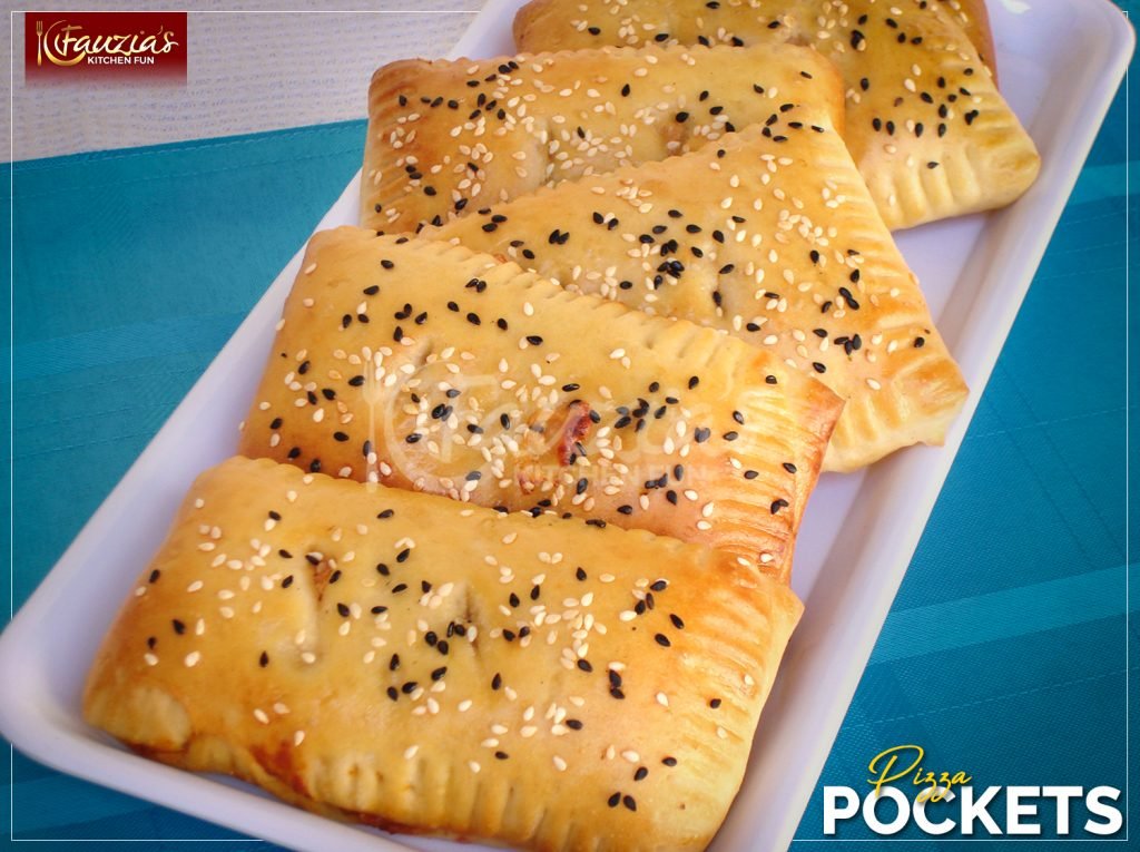 - Once risen, knock the dough down and divide it into 2 equal balls. (PIC 1)Roll each ball out into a rectangle of about a quarter inch thickness or slightly thinner. Divide the rectangle into 4 sections. (PIC 2)Add some pizza sauce, filling, toppings and cheese on one half of each of the sections. Make sure not to over-load each portion as then it would be difficult to seal them. (PICS 3 & 4)Fold over the top part and seal securely with a fork that’s been dipped lightly in flour to form pockets. Repeat with the second ball of dough. (PICS 5 & 6)Place these stuffed pockets on an oiled tray and let them rise again for another 20-30 minutes. (PIC 7)Preheat the oven at 180 C. Then make a couple of small slits on each pocket which will help any steam to escape during baking. Brush each pocket with egg wash and sprinkle sesame seeds over them. (PIC 8)Bake in a preheated oven at 180 C for about 20 minutes or until golden and cooked through. (FINAL PIC)You can apply a bit of butter when they are straight out of the oven (to give them an amazing aroma and to help soften them further). Make sure you cover them in a soft cloth for at least 15 mins before serving. This makes them extra soft.Enjoy!Â