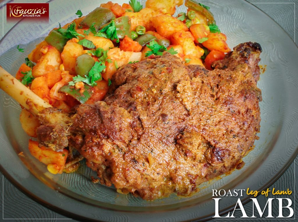 - Clean the leg and trim any excess fat. Using a sharp knife, make some slashes on the meat and then poke through the meat a few times using the knife to make deep holes which will act as little pockets for the marinade later.Mix the rest of the ingredients well and then slather the marinde onto the leg, turning it over and making sure every last inch is well coated. Cover and refrigerate overnight or for up to a day for better flavour. If possible, turn the leg in the marinade once during refrigeration to make sure that it gets evenly marinated on both sides.Remove from the fridge an hour before you begin cooking to give the meat time to come to room temperature.Preheat the oven at 180 C. Grease a roasting pan and place the leg with all its marinade into it. Add 1 cup of room temperature water in the pan around the leg. Cover with aluminium foil forming a slight dome with the foil so that it does not stick to the meat as it roasts.Put the pan into the preheated oven and bake for 1 hour. Then turn the heat down to 170 C and keep baking for another hour. Check on the meat to see if it is tender, you can give it another 30 minutes if needed. I normally turn the leg over once in between  to keep both sides moist and juicy. If needed, you can add another half a cup to a full cup of WARM water to prevent the roast from sticking to the pan.Once done to perfection, you can remove the foil and give the roast 10 minutes under a hot grill. Then cover and allow the roast to rest for at least 10 minutes before serving. Any leftover juices in the pan can be used as gravy.Serve with mixed veggies, a salad and naans or dinner rolls.Enjoy!! 🙂