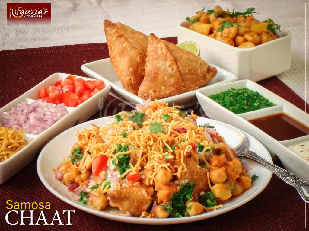- Prepare the aloo samosas using THIS recipe.Prepare the chickpeas/cholay using THIS recipe.  (you can even simply use plain boiled chickpeas but I prefer building flavour by cooking them first with the boiled cubed potatoes).Here are the recipes for green chutney and aamli.Now all you need to do is assemble the samosa chaat.Make sure to assemble the dish JUST before serving as it is best served immediately to ensure that the crispy/crunchy components do not get soft and soggy.On a plate, crush two samosas lightly (or chop each one up into 3-4 pieces). Add a heaping amount of chickpeas and potato mixture. Then sprinkle some of the finely chopped tomato, onion and chillies.  Add a pinch or two of the chaat masala, cumin powder and chilli powder. Drizzle about 2 tbsp of the whisked yoghurt followed by a bit of green chutney and aamli/tamarind sauce.  Then top the entire lot with some chopped coriander and crushed sev (gram flour vermicelli). Serve immediately.Enjoy!  🙂