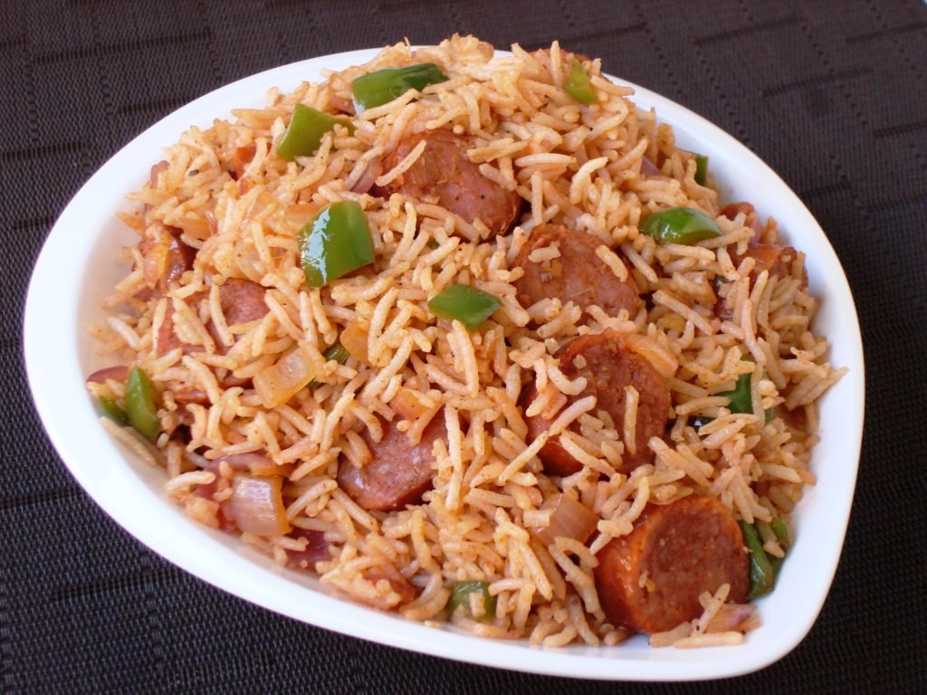 - Heat 1 tbsp oil in a pan, add the sausage slices and cook until golden brown on both sides. Remove them onto a plate.There should be enough residual oil in the pan from cooking the sausages, but if not then add 1 more tbsp of oil. Add the onions and saute until softened and translucent. Then add the capsicum pieces, cumin powder, tomato paste, red chilli flakes and garlic paste. Stir fry until the capsicum are slightly softened.Add the rice and drizzle in the tomato sauce, soy sauce and vinegar. Gently mix until everything is well combined then add back in the sausage slices and stir them in.Drizzle a splash of water (about 2 tbsp) onto the rice, cover with a tight lid and put the pan on low heat to steam for about 5-10 minutes just to allow all the flavours to infuse properly into each other. Garnish with a bit of fresh coriander/cilantro if you have it and serve with a side salad.Enjoy!