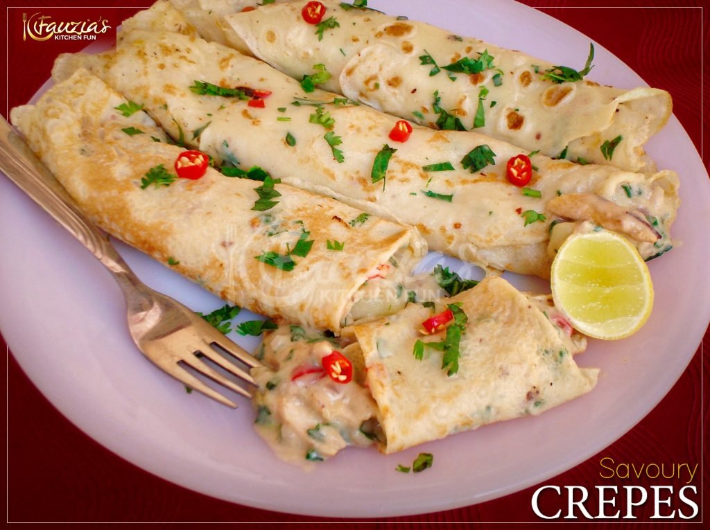 - First, prepare the FillingMarinate the chicken strips in the marinade ingredients for at least 30 minutes. Then grill or fry the chicken until done (takes about 3 minutes per side) and slice into bite-sized pieces. Set aside.Next, heat the butter, fry onions until soft then add the flour, salt and black pepper. Add the milk, cook until it thickens, mix in the cooked chicken (and cooked mushrooms/potatoes if you are using them) add chopped green chilies and coriander leaves. Turn off the heat and you’re done.Now, prepare the CrêpesPut the flour, chopped chilli, chopped coriander and salt in a mixing bowl and give them a quick stir using a whisk to combine the ingredients and aerate the flour. These will be your dry ingredients.In a small jug, pour the milk, water and eggs. Whisk them together just to combine. These are the wet ingredients.Make a well in your dry ingredients and gradually pour the wet ingredients whilst whisking until you have a thin batter. Lastly, add the melted butter and drop of garlic paste and whisk until it has incorporated.You can now use the batter right away or cover and rest it for 30 minutes in the refrigerator. This batter can keep perfectly for up to 2 days if refrigerated. Remember to give the batter a quick stir before using.To cook the crêpes, heat your frying pan on medium heat until very hot. Put a few drops of oil or butter and swirl it around or wipe it with a kitchen towel to have a thin coating of oil on the pan.Scoop about a 1/4 cup (use a measuring cup if you have one) of batter and pour it on the hot pan. Grab the handle and swirl the pan around to distribute the batter evenly and as thinly as possible. Set the pan back on the heat and cook for about a minute or less. Once the bottom of the crêpe is slightly browned and cooked, flip it over and cook the other side.Remove the ready crêpe on a plate and wipe the pan with a drop of oil in preparation for the next one. Repeat the procedure until all the crêpes are done and ready.Roll some of the filling in each crêpe and serve warm.Enjoy!