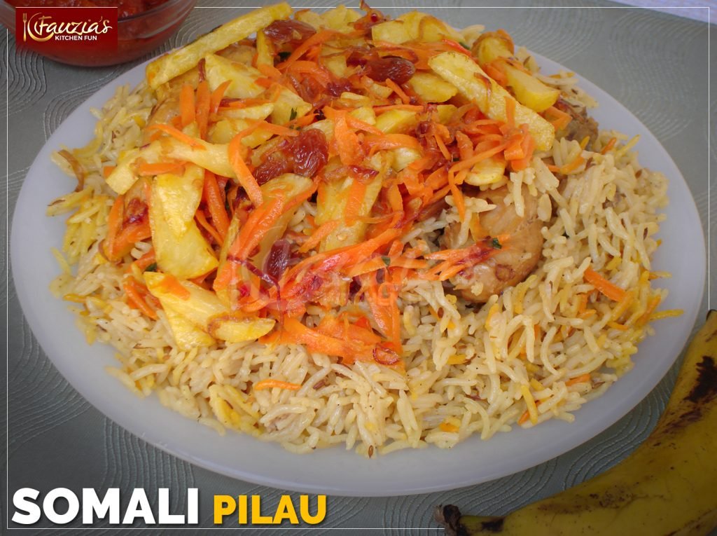 - Cook over medium heat giving an occasional stir until most of the liquid is gone, then turn the heat down to very low. Add the food colouring or saffron water to one side. Cover with a tight lid to seal and let the pilau steam on very low heat for about 15 minutes.In the meantime, prepare the topping. Deep fry the potato strips like you would french fries or chips. Drain on paper towels. In a pan, add the butter and oil, then add the bell pepper, sliced onions and grated carrots. Saute continuously until the veggies are soft and the onions begin to take some colour. Add the raisins and allow them to plump up. Lastly add the fried potatoes and season with salt and 1 tsp of Xawaash spice. Stir together well and turn the heat off.Fluff up the pilau and mix in the coloured rice evenly into the rest of the rice. Serve on a platter with the colourful topping. I also like to serve this dish with my spicy tomato chutney. And a Somali dish is incomplete without a banana on the side!Enjoy!