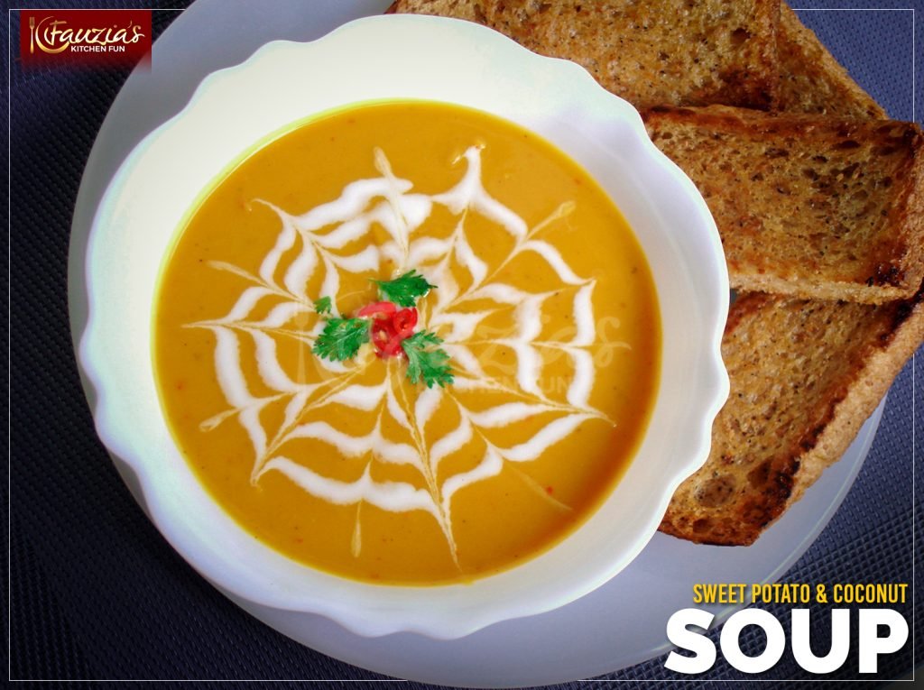 - Peel and chop the sweet potatoes into cubes. Rinse them well to get rid of the excess starch. Drain and put them in a pan, add enough water to cover them and 1 tsp. of salt. Simmer on medium heat until the potatoes are fork-tender. Drain and drizzle 1 tbsp. of melted butter over them. Lay them out on a tray and put the tray in a hot oven for about 10 minutes, turning the potatoes once midway to make sure they are evenly roasted. This step helps caramelise the natural sugars found in the sweet potatoes which brings out the sweetness even more.While they are roasting, heat 1 tbsp of butter or oil in a pan, then add the chopped onions and fry until they are transluscent but not completely brown. Add the garlic and ginger pastes, the chilli flakes or chopped red chilli. Then add the cumin, turmeric and black pepper powders. Give them a stir for half a minute then put the roasted sweet potato cubes in. Turn the heat down and stir them for a few minutes so they get coated with the lovely spices. Then add 2 cups of warm water and some salt. Turn down the heat, cover the pan and allow to simmer for about 15 minutes, giving an occasional stir until the water has reduced slightly and the potatoes are completely tender.Turn off the heat and blend everything into a smooth paste either using an immersion/stick blender or allow everything to cool slightly then us a regular processor or blender.Put the mixture back into the pan and add the coconut milk. Simmer for 10 more minutes and adjust salt and spice. If the soup feels too thick, add more warm water. If it is too thin, simmer it a bit longer until it thickens. Finally, squeeze in some lemon juice, give it a final stir and turn off the heat.You can garnish with some reserved coconut milk when serving in the bowls.Enjoy! Â